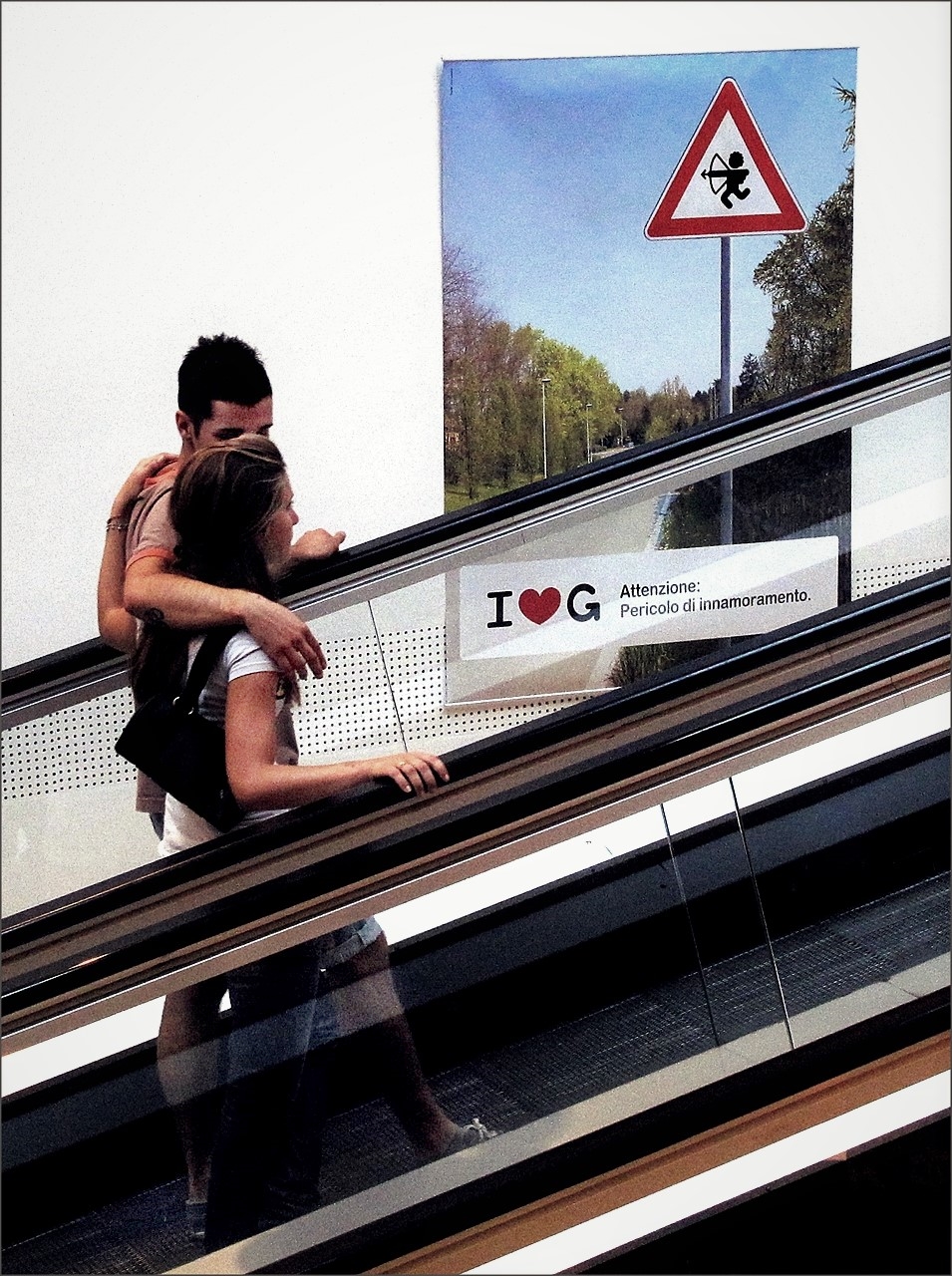 Sempre bravo a coglierne momenti particolari.. come in questa immagine che ci proponi.. ii due innamorati mentre salgono con la scala mobile in prossimità del cartello.. Ben fatta.