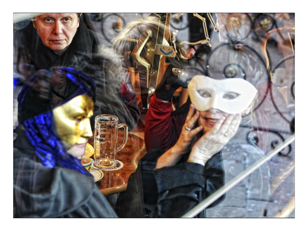 Due maschere in primo piano un po sfocate, un volto al centro mosso e da far girar la testa, un altro perfettamente a fuoco nell'angolo alto a sx che grazie al bellissimo gioco di sfocature cattura l'attenzione.