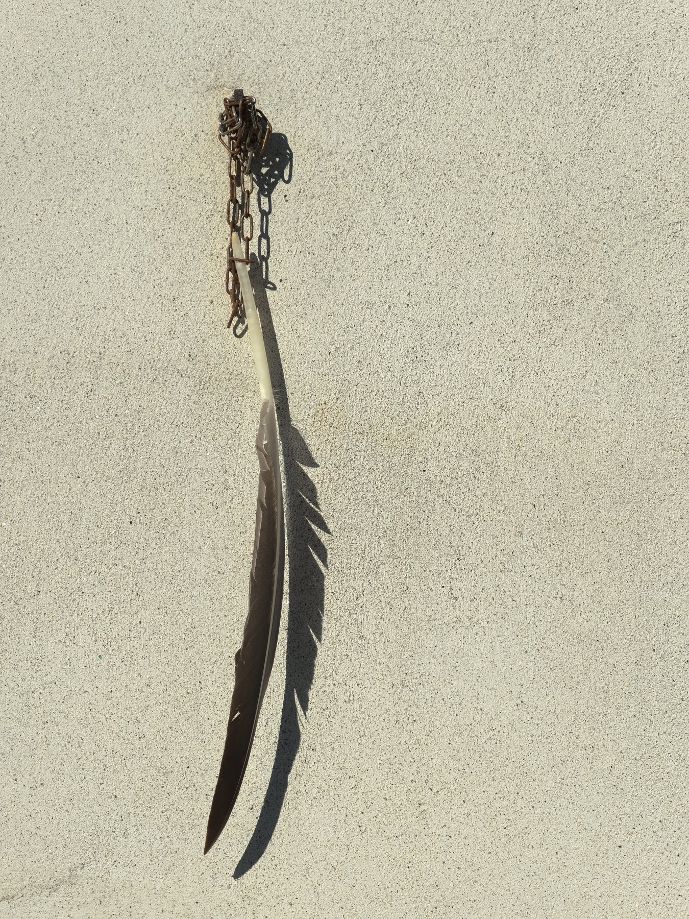 La catena imprigiona la leggerezza della piuma, appesa verso il basso. La sensazione che trasmette la foto è quello di libertà negata amplificata anche dai toni scuri sul muro ruvido e dalle ombre nette.