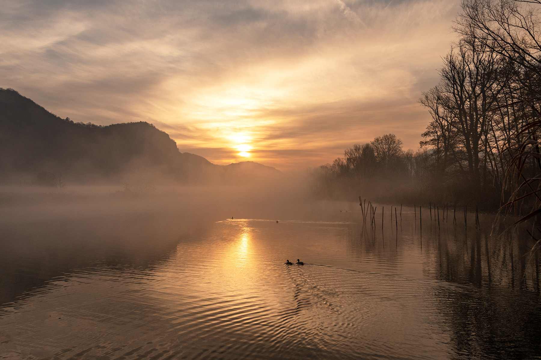 In questo caso sono molto carine le prime due anatre che se ne vanno beatamente verso il sole basso e che con la loro scia rompono la calma piatta del pelo dell'acqua.