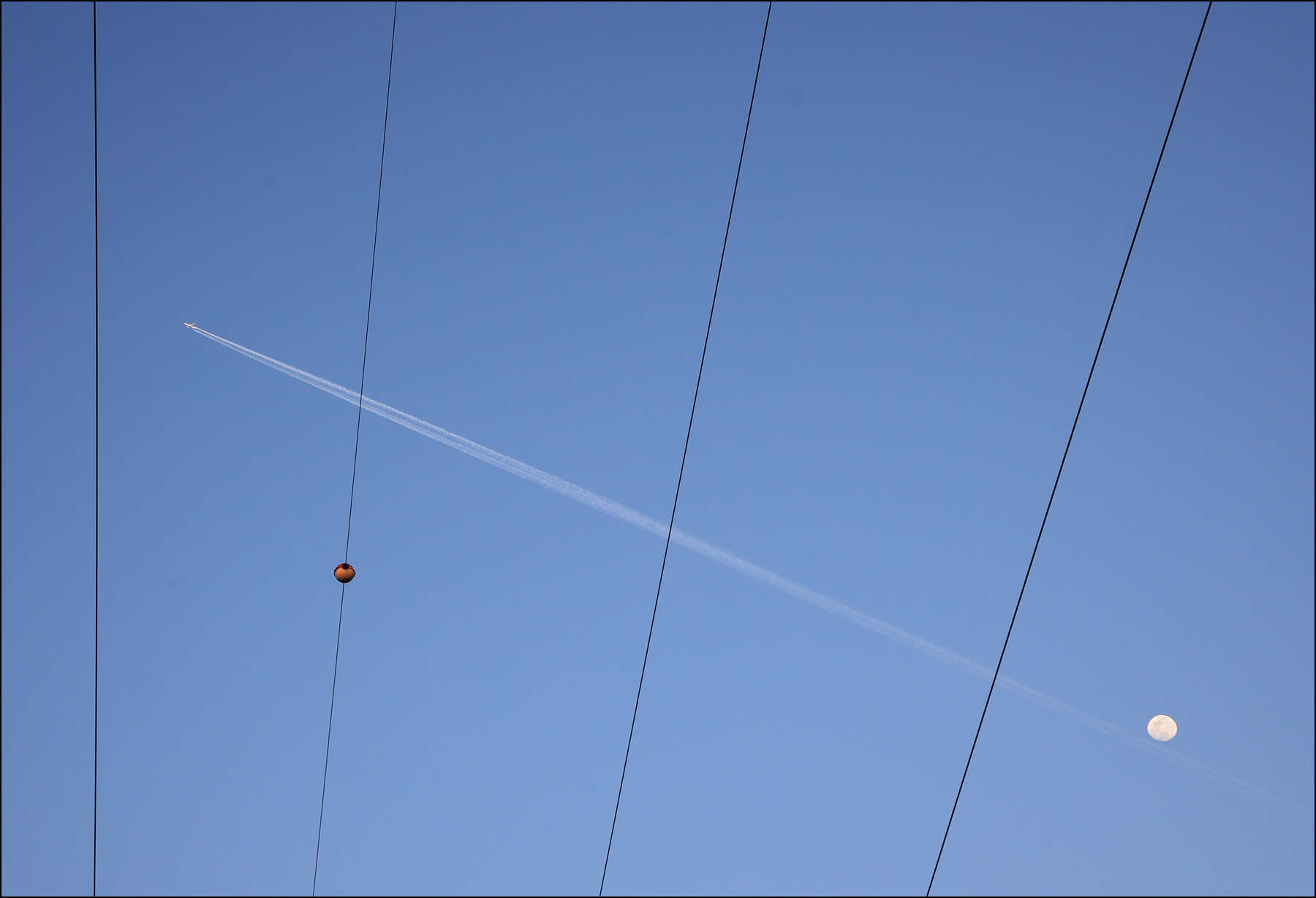 Un aereo che sfreccia tra due mondi: la luna e quello immaginario della sfera sul filo, crea uno scatto molto dinamico che i fili in diagonale contribuiscono ad accrescere.