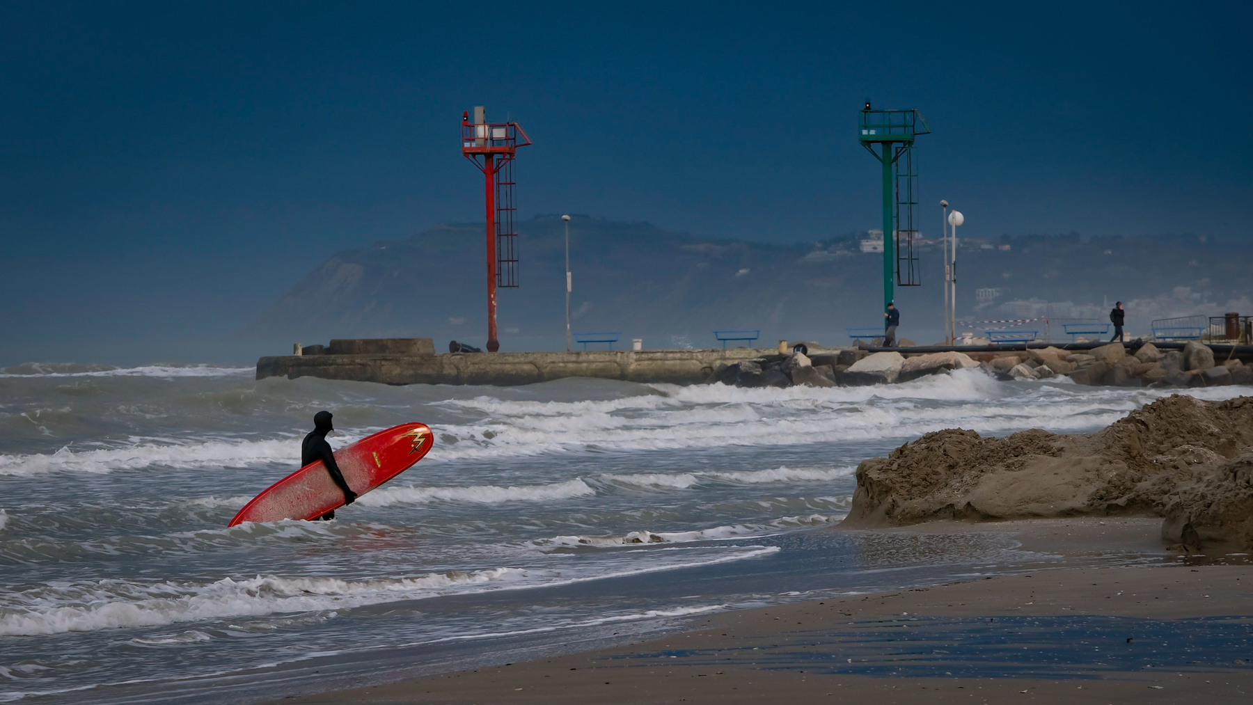 Un soggetto meritevole ben valorizzato da una azzeccata composizione, tutto al punto giusto con le due torrette colorate a vivacizzare lo sfondo e l'impavido surfista con la sua tavola rossa perfettamente in tinta.