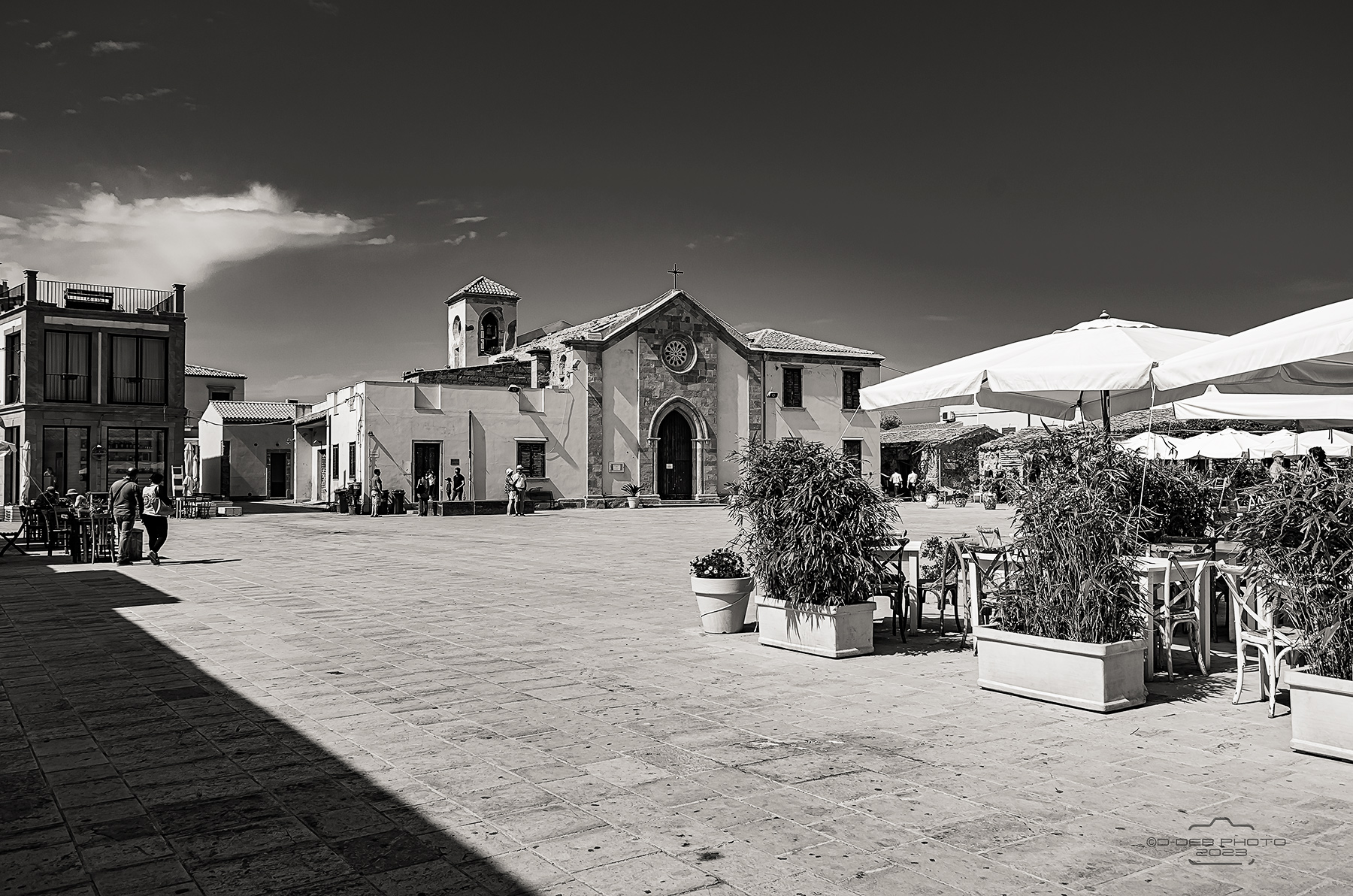 Lo sguardo conduce direttamente sulla chiesa chiusa com'è tra ombrelloni a dx, e una casa a sx, e delimitata dalle interessanti ombre geometriche.