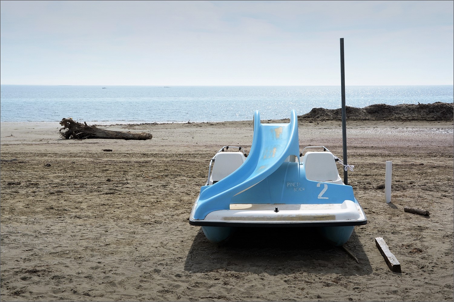 La manipolazione è forte ma a me piace rendendola una foto mal tenuta in un cassetto per qualche decennio, non facendo stonare il pedalò di oggi.