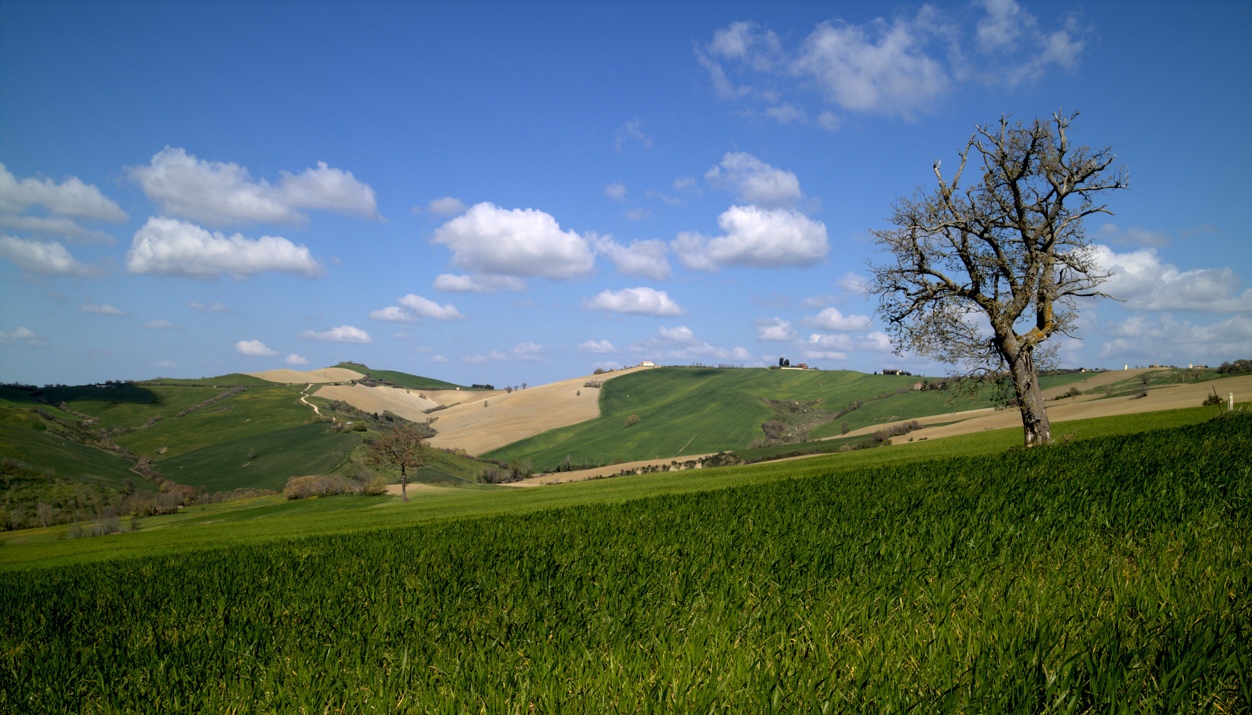Mi piace la stratificazione orizzontale e l'alternarsi di verde e campi lavorati, l'albero l'avrei preferito nei pressi del terzo.