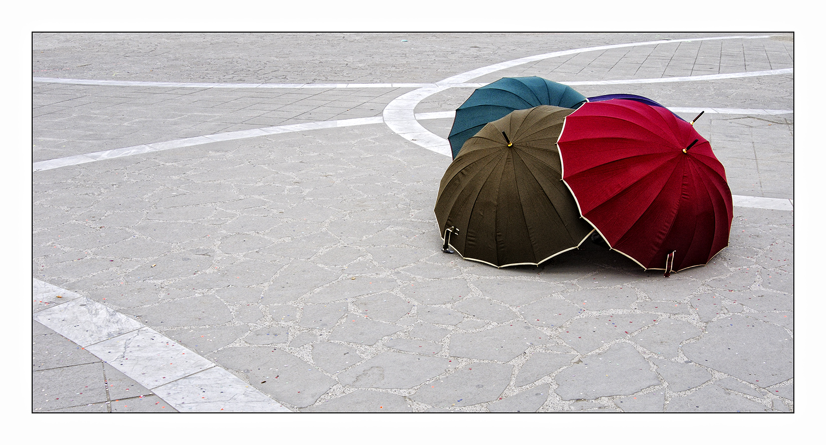 Uno scatto pulito, essenziale. Sulla pavimentazione grigia, geometrica, ben collocati emergono questi ombrelli bene assemblati che con i loro colori esercitano una forte attrazione.
