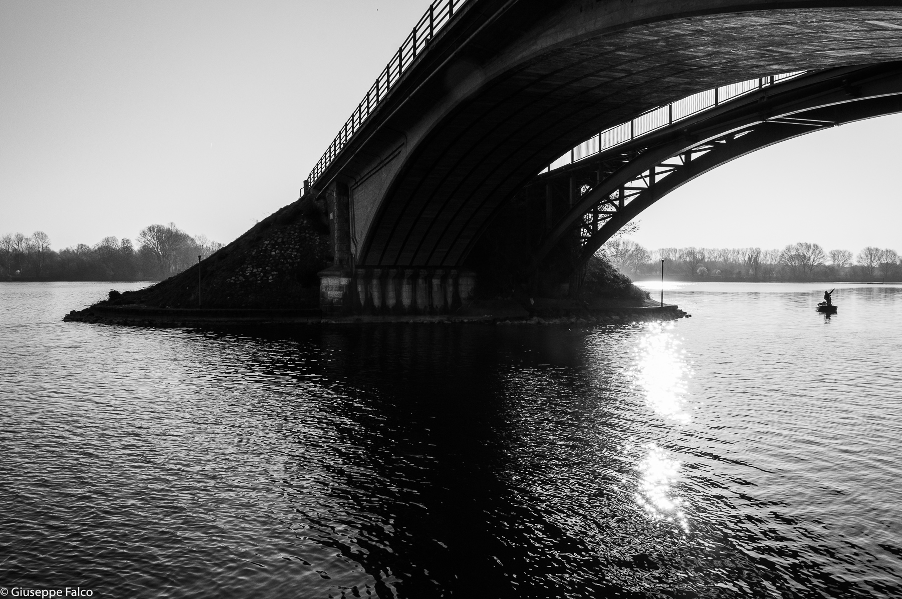 Conosco questa veduta del ponte, la composizione mi piace e l'inserimento del pescatore lo trovo adeguato. Il BN deciso descrive bene il forte controluce della ripresa.