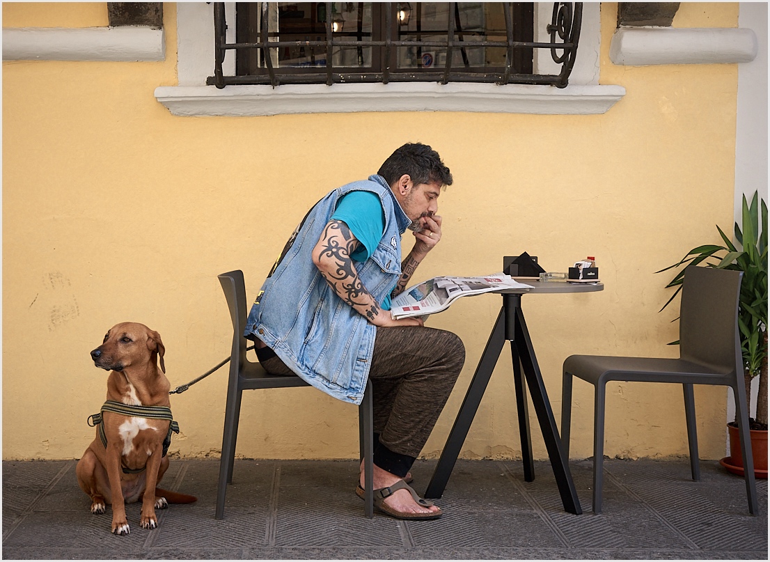 Sano interesse per la lettura della carta stampata, bello il momento colto col cane paziente. Anche il tatuaggio sul braccio richiama le volute dell'inferriata.