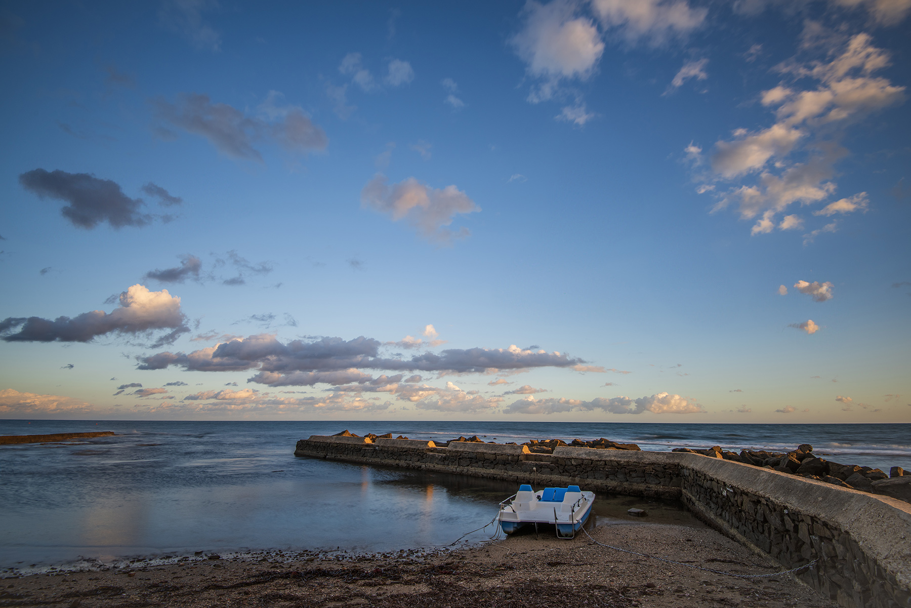 Il cielo, con quelle belle nuvolette, è reso dinamico, contrapposto alla staticità del mare e del pedalò. I sono ben resi e la luce che colpisce le pietre e in parte manufatto regala vivacità