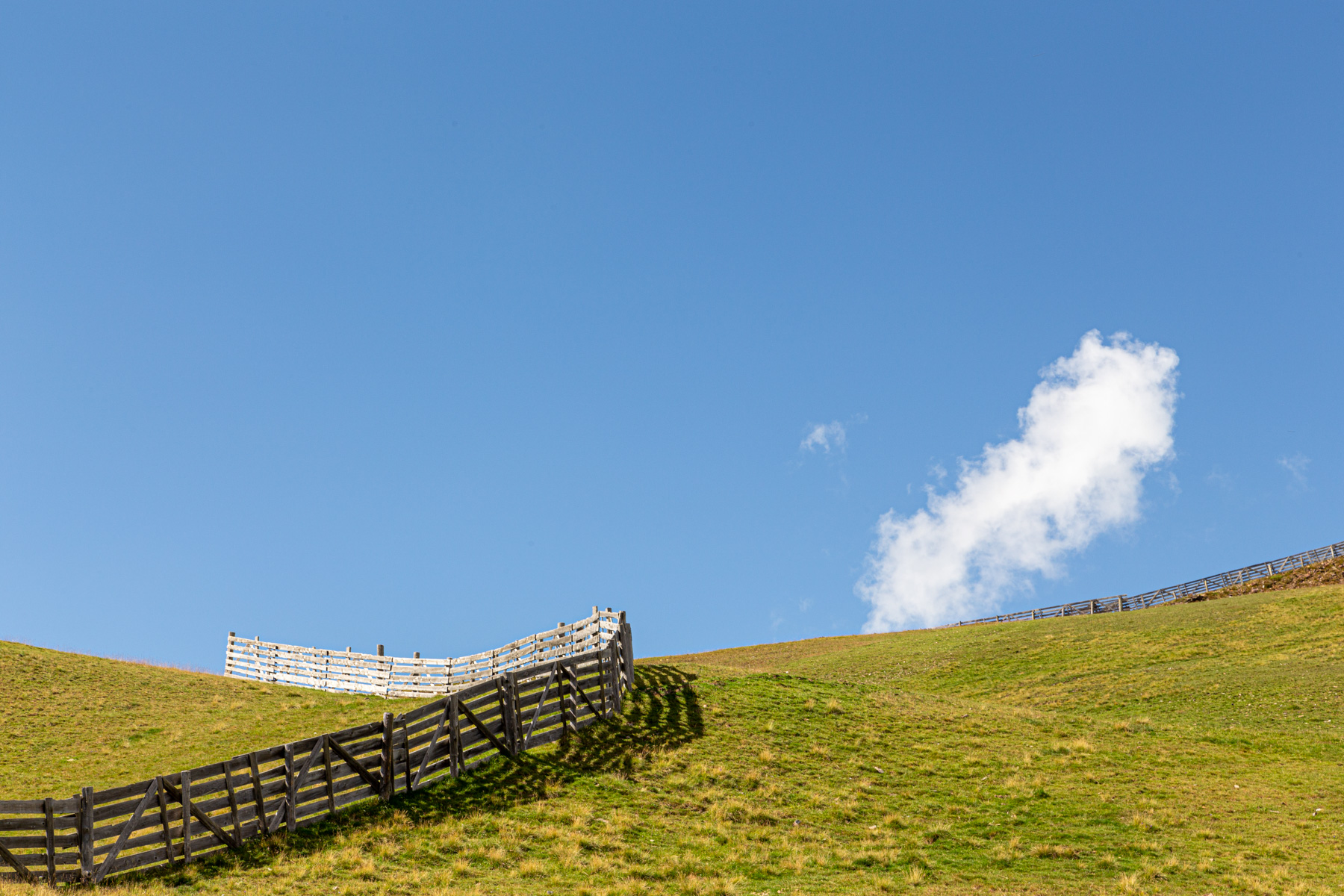 Un paesaggio fresco, pulito, minimale. Staccionata che cede il testimone alla nuvola per valorizzare la diagonale, creando un piacevole movimento nella scena, accentuato dalla curvatura del verde che dona profondità. Un bel colpo d'occhio. Per me semplice e piacevole!