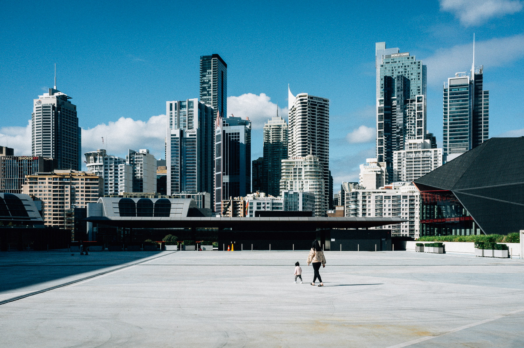 Paesaggio urbano fitto di palazzi che sembrano contendersi ogni centimetro di terra, la donna e bambina nell'ariosa piazza deserta donano respiro alla bella'immagine