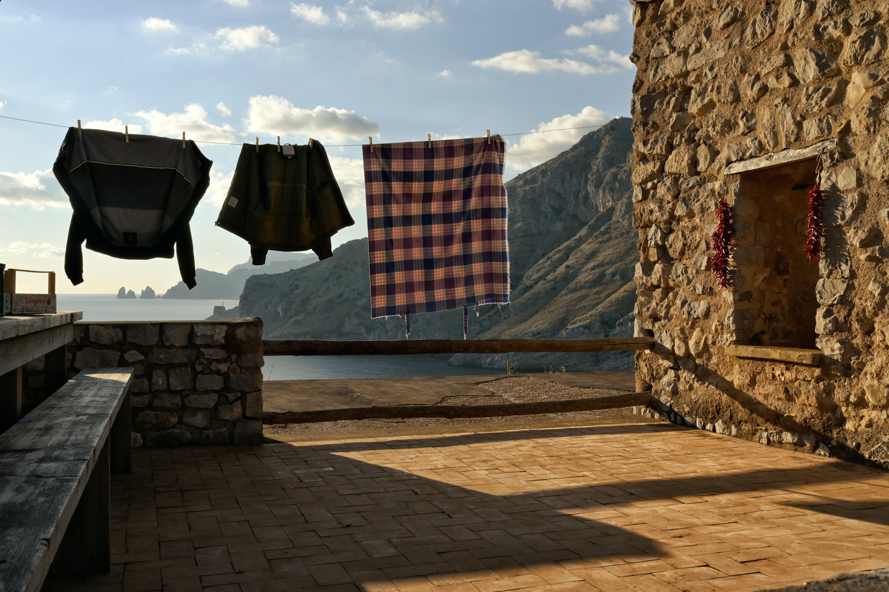 In questa foto Fabio ha estrapolato e direi quasi depurato gli elementi decorativi da cartolina. Il paesaggio si fonde (ed è un tutt'uno con essi) con questi panni al sole per narrarci un momento minimo di vita e non solo una bella scena naturalistica.