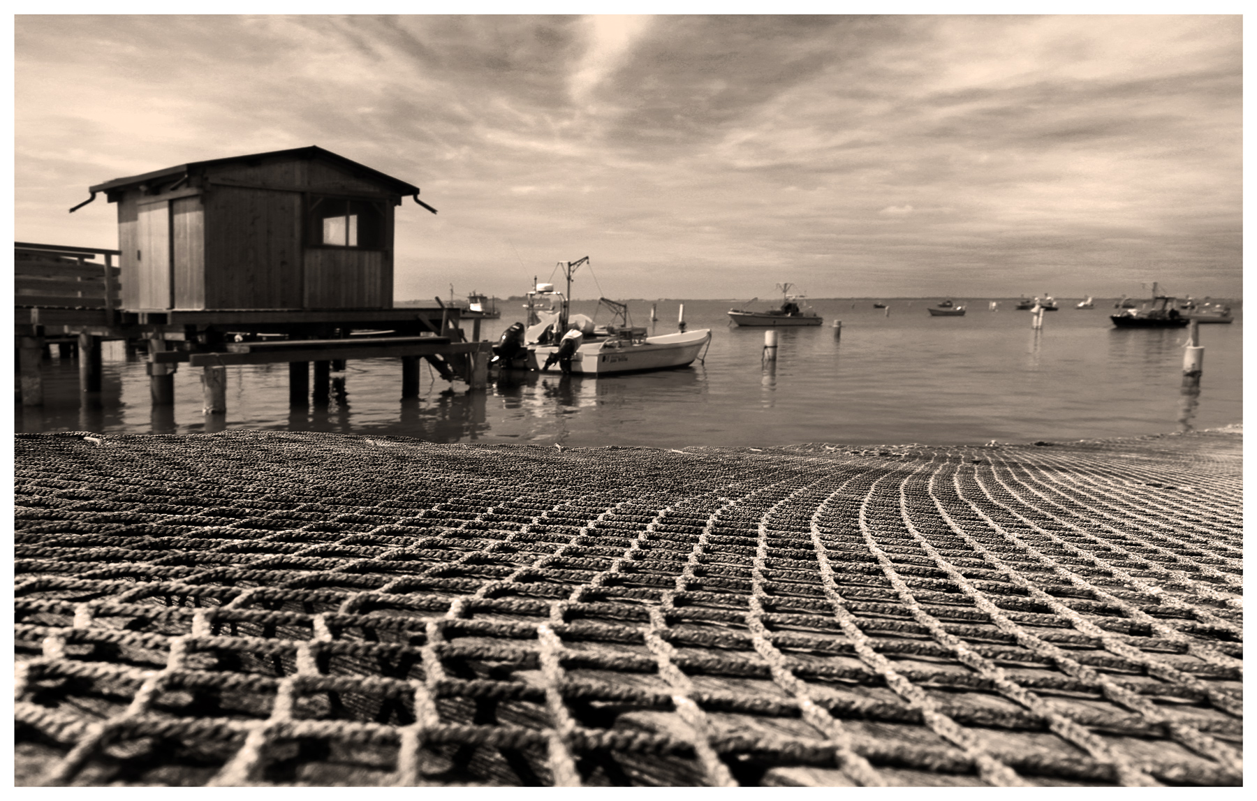 | Le maglie a scacchi della rete così bene in tensione e allineate sul piano orizzontale vengono a costituire un ideale pavimentazione dal sapore peschiero. La vista sul mare con questo viraggio seppia piuttosto deciso fa assumere all'immagine un sapore datato. Nel complesso ne è uscita una foto che funziona e affascina l'osservatore. Ciao, Tiziano |