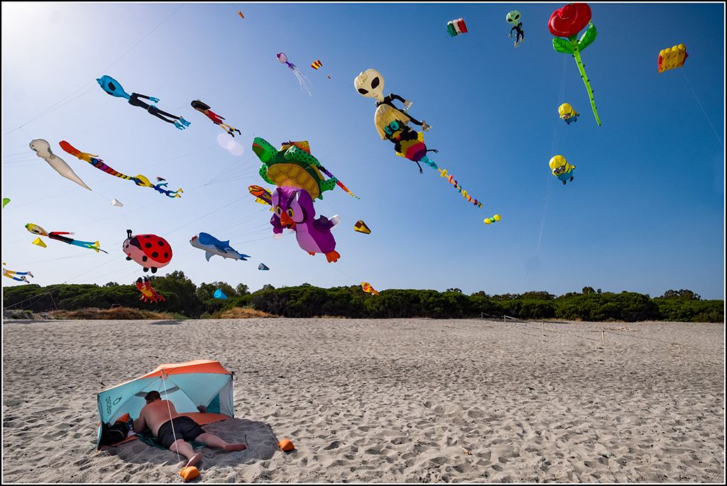 Carino anche l'uomo in relax sovrastato dalla moltitudine di aquiloni, di cui è apparentemente ignaro o noncurante.