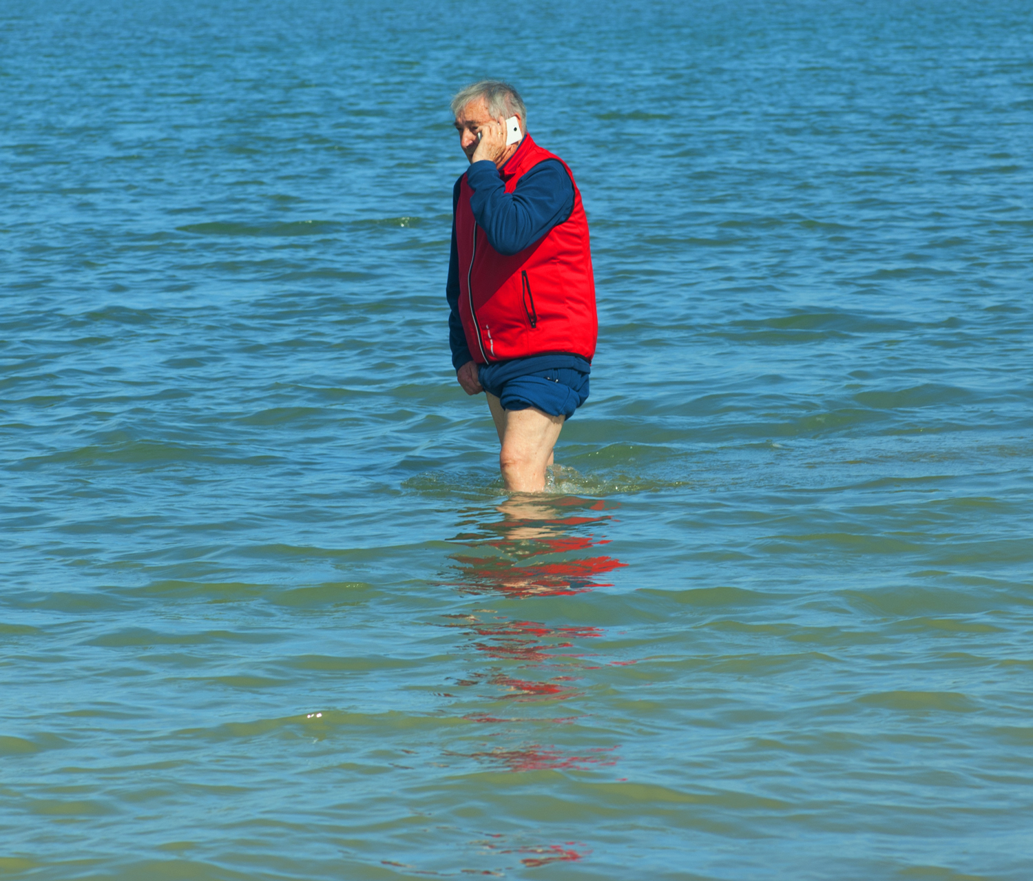 Abbigliamento non proprio da mare, posa telefonica da giovanotto, me lo immagino alla ricerca di avvenenti signore.