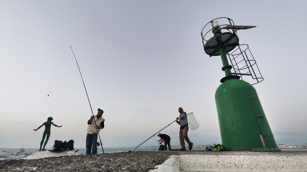 Straniante… L’effetto non raddrizzato del grandangolo, unito a una buona distribuzione di pescatori e relative lenze, ha restituito un’immagine originale e accattivante Ok! Molto brava a vederla Smile
