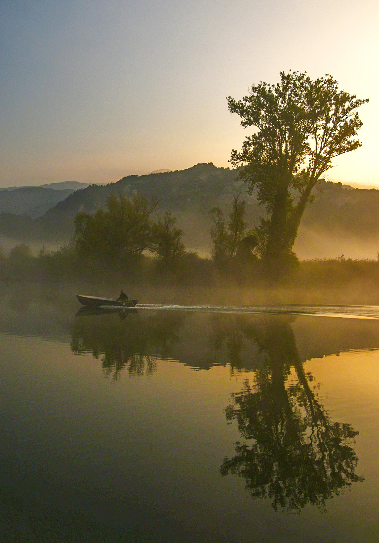 Bella composizione appoggiata sull'incrocio scia/barca-albero/riflesso.