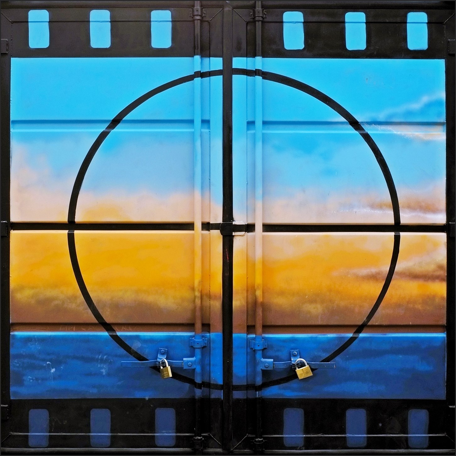 I lati in alto e in basso sembrano disegnare la dentatura della pellicola di un film che ha come tema un paesaggio al tramonto con i suoi colori vivi.