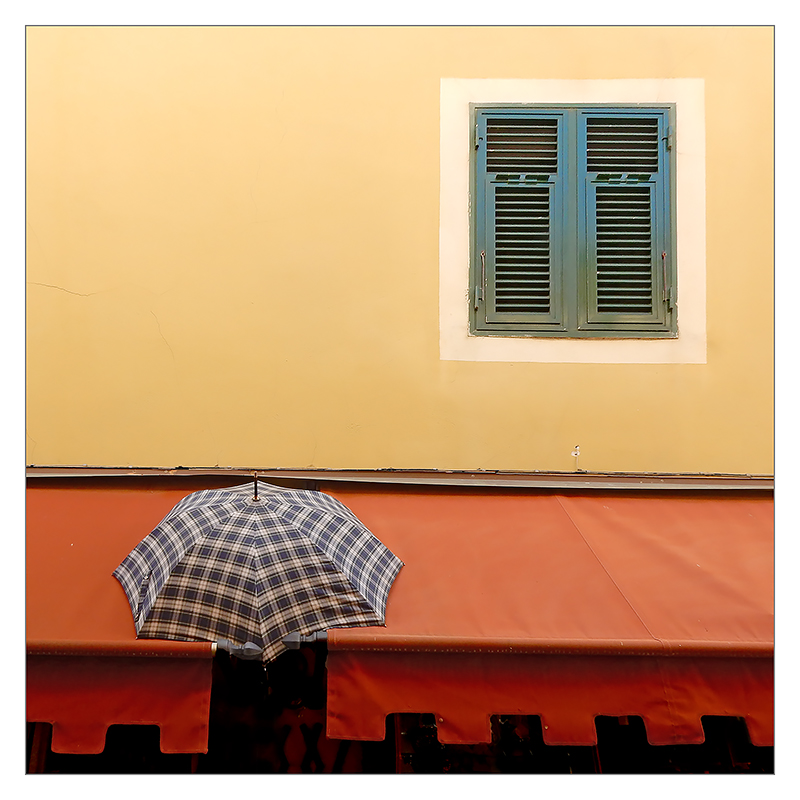 Una foto che trovo molto piacevole, sei stata brava a vedere questa scena curiosa e poi a tenere tutto in equilibrio bilanciando la posizione della finestra con quella dell'ombrello. Risulta pulita ed elegante, con i colori in armonia.