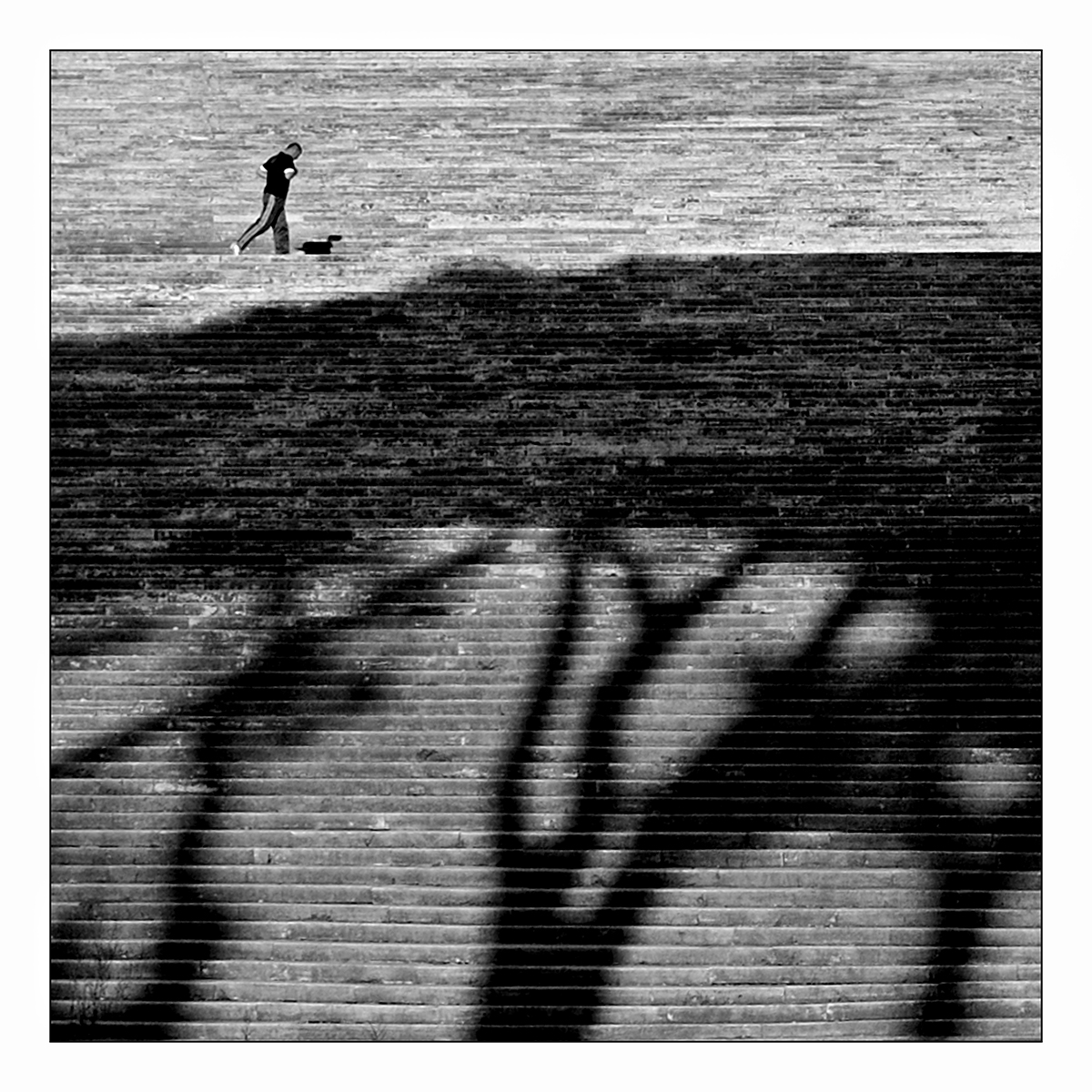 L'ombra gigantesca dell'albero in confronto con l'ombra piccola della persona in un contesto fatto tutto di scale.