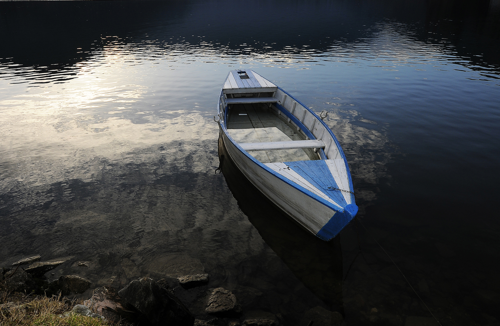 Un bel senso di quiete accoglie questa piccola barca dai colori che si esaltano in questo ambiente forse un poco cupo. I riflessi sono sempre un preziosissimo valore aggiunto e hai fatto bene ad includere per intero quello della barca, così come mi piace l'inclusione della terra nell'angolo in basso a sx. Ti consiglierei però di rifilare un poco in alto, non tanto per ridurre la porzione scura, ma quanto basta per eliminare quella lingua luminosa in alto a sx.  _________________