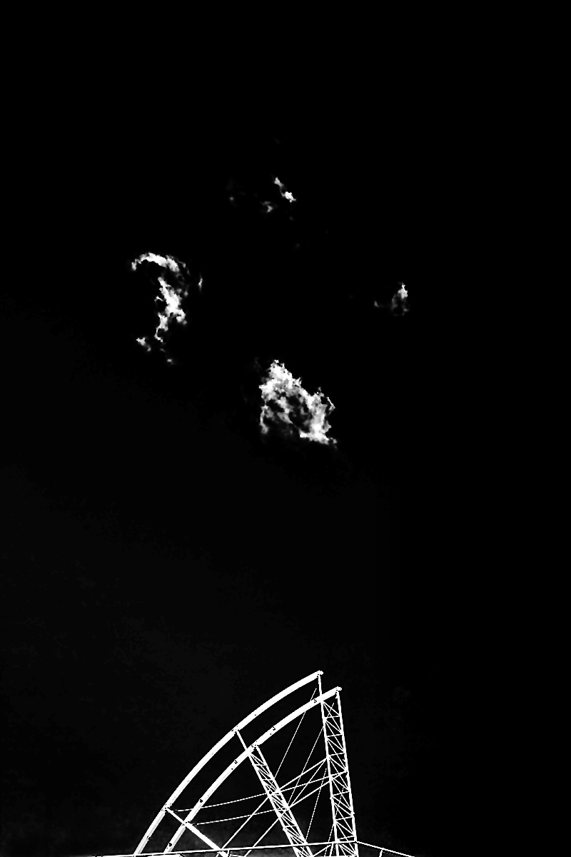 Posso azzardare, sfruttando l'aiuto del titolo, che il concetto base sia l'irruzione nel mondo indefinito delle nuvole (se sono nuvole) da parte dell'oggetto geometrico (''definito'').