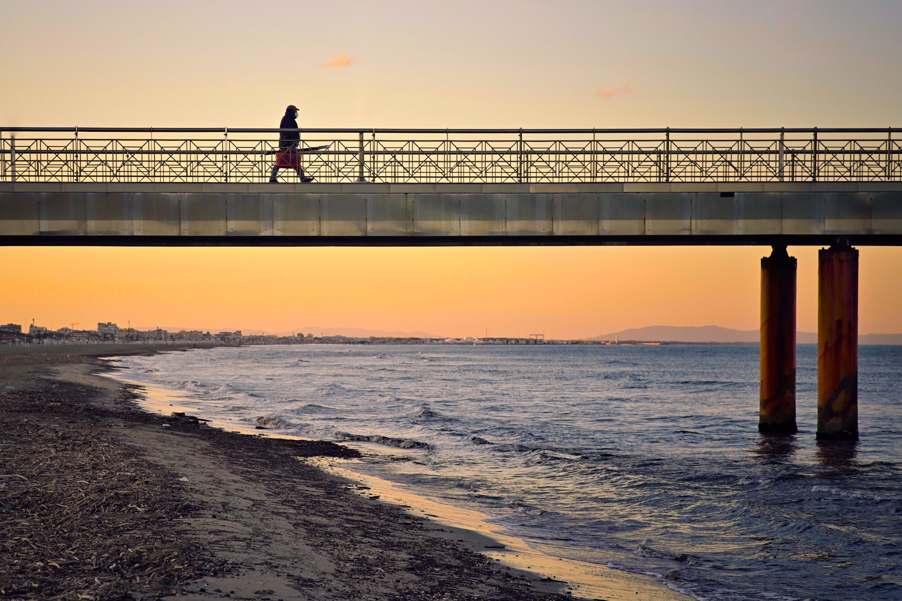 Il pontile rialzato riempie il bel cielo dai toni arancio, il pescatore che avanza deciso verso il mare ha sopra di lui una leggera nuvoletta dai rimandi fantozziani.