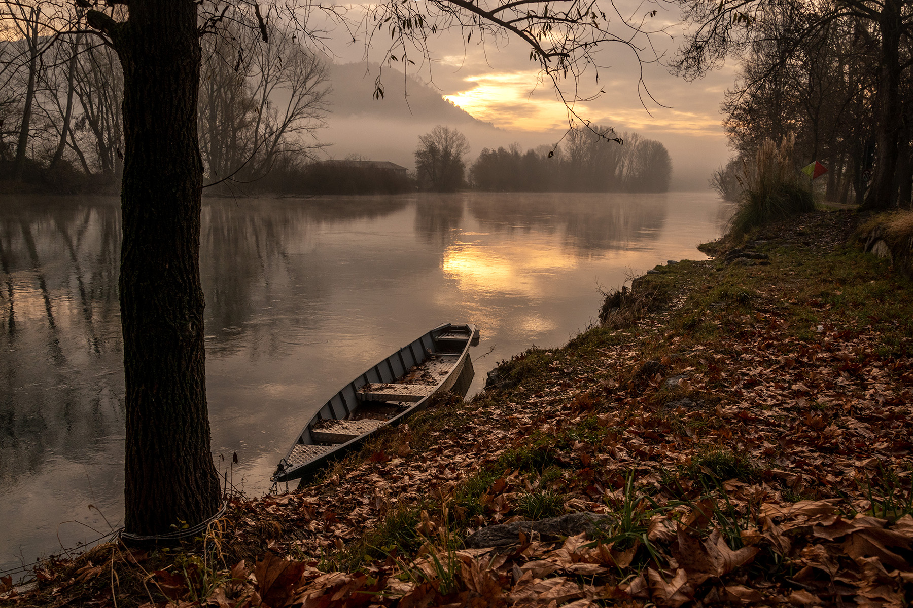 Il tappeto di foglie, la luce languida, la barchetta che da un po il senso di abbandono, danno un senso di struggente malinconia.
