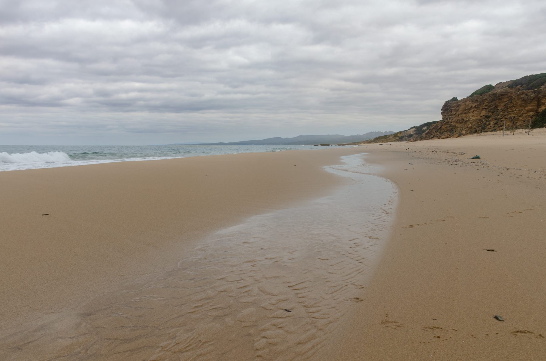 La striscia sinuosa dell'acqua guida lo sguardo quasi fin dove le rocce a metà frame si intersecano con le montagne sullo sfondo, mentre il cielo sovrasta la spiaggia e accompagna il "rumore" del mare.