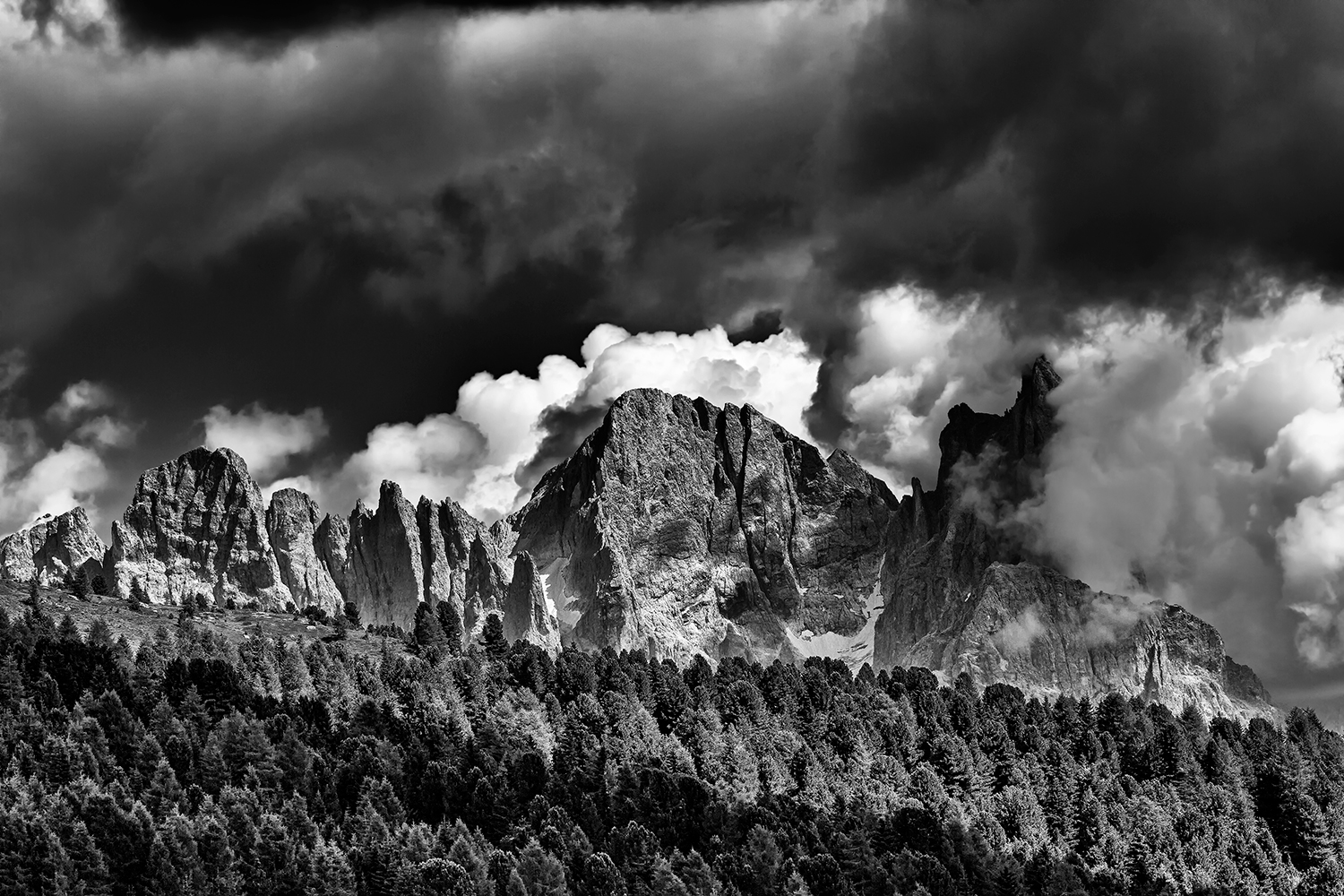 Notevolissima immagine, col bianconero poderoso per poderose montagne dolomitica. Sempre di notevole impatto il movimento nuvoloso nel cielo estivo . Ottima! Ciao, Francesco _________________ Fotocamere Olympus OMD e PEN, Panasonic G3. Software GIMP