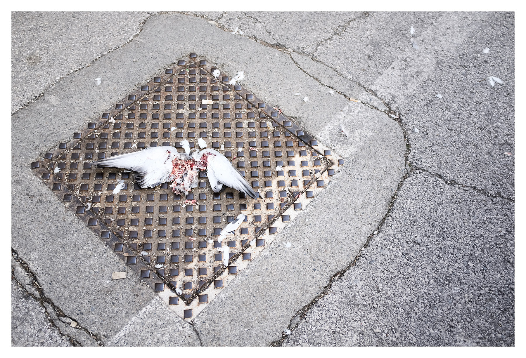 Ben angolato lo sguardo rispetto al quadrato del tombino, giusto, ma magari eccessivo il decentramento a sinistra.