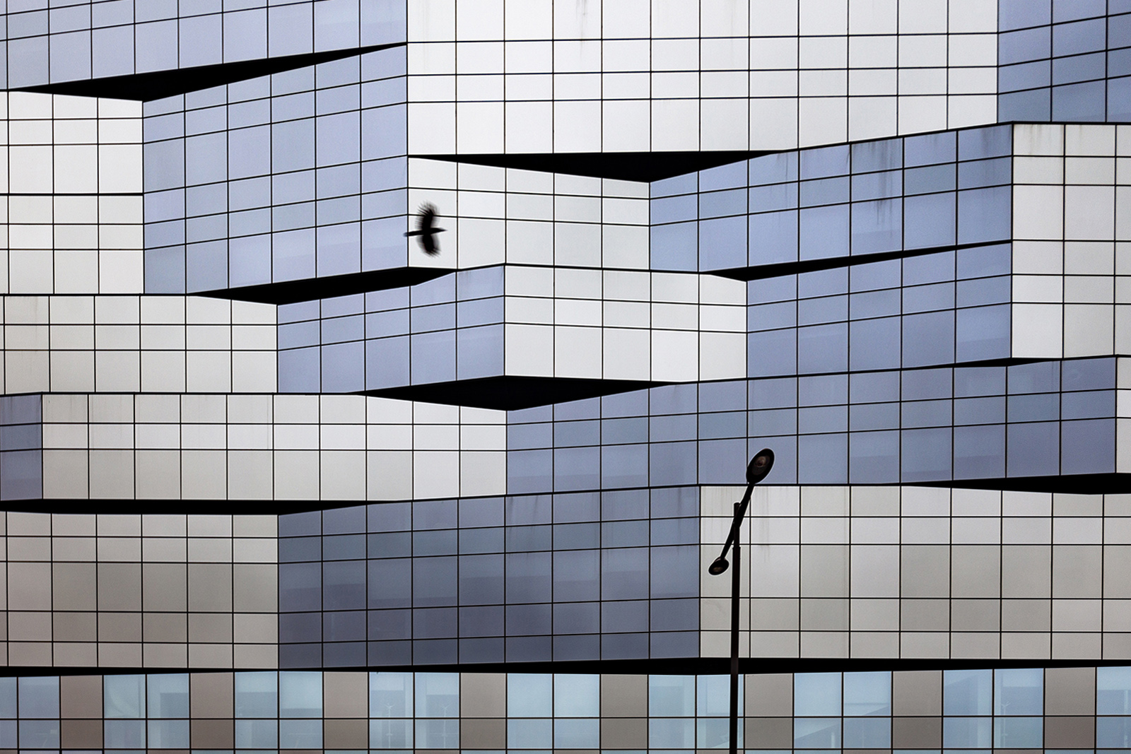 Sul volatile (corvo o piccione non saprei dire), io credo che la sua presenza sia invece qualificante per due motivi: un mosso in tanto equilibrio statico ortogonale ed un afflato vitale in tanto vetro cemento inanimato!