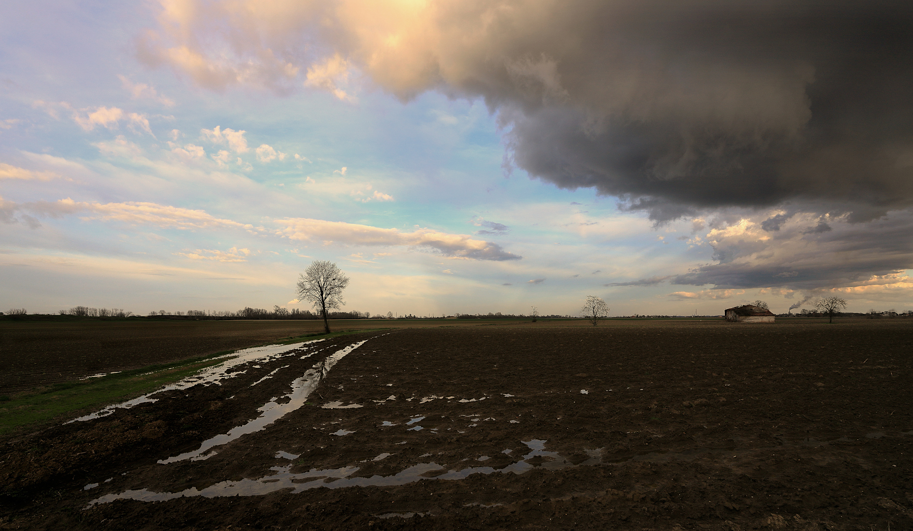 Molto bello il mutamento di scena: a sx i "canali" d'acqua che conducono all'alberello con un paesaggio aperto, a dx quelle nuvole basse, stratificate che incombono sul casolare e che fanno un ambiente più cupo.