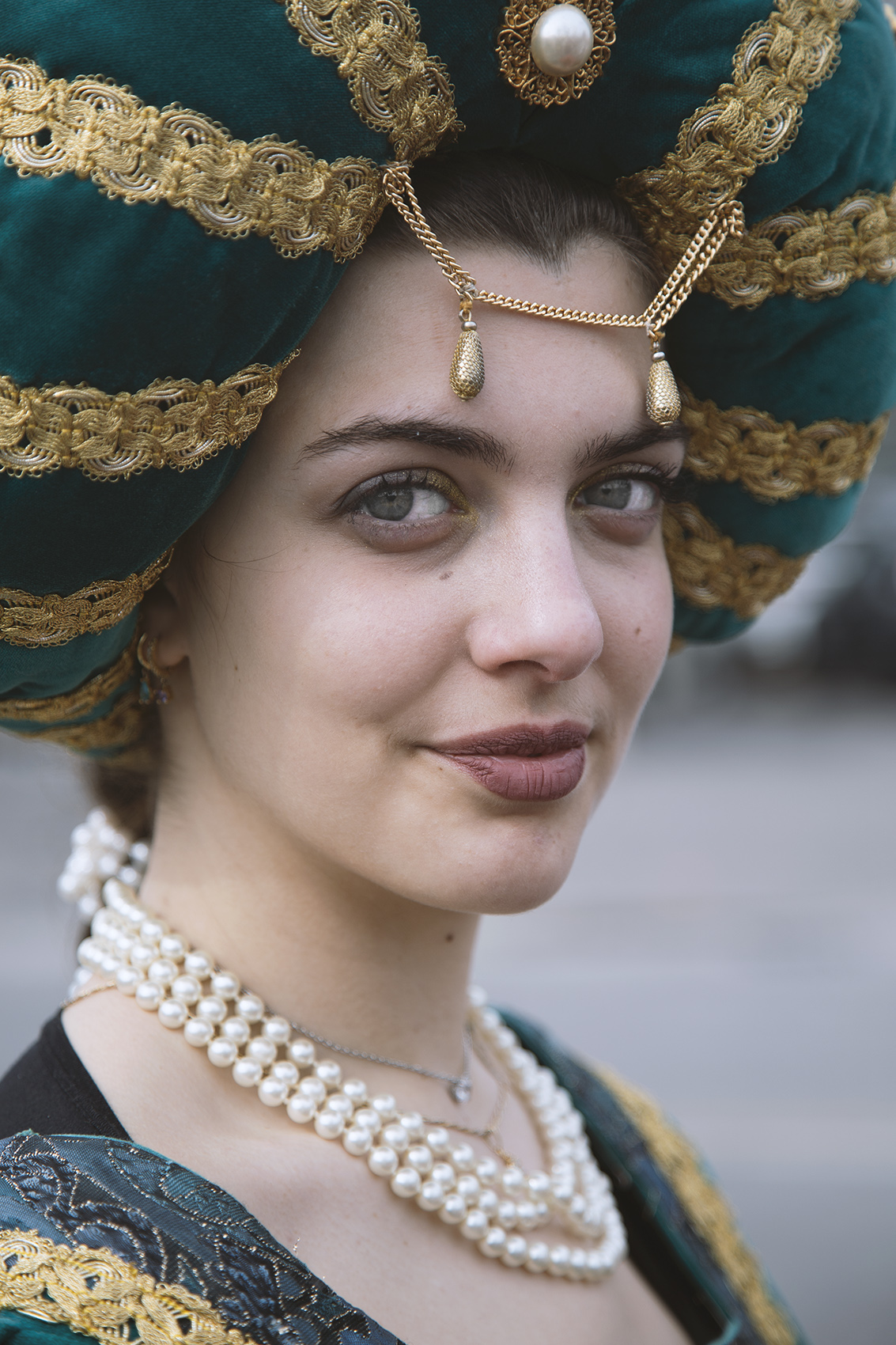Un colpo che fa pieno centro. La scelta di dare il massimo risalto a quello sguardo intenso, all'espressione compiaciuta di chi ha la consapevolezza di essere un soggetto interessante, vince nettamente sulle piccole imperfezioni estetiche di questo piacevole scatto. Potremmo dire che sarebbe stato meglio includere per intero la scollatura dell'antico abito, o che il taglio deciso non rende giustizia all'elegante ed ornato copricapo. Considerazioni ineccepibili, da un punto di vista formale; ma un'inquadratura più ampia avrebbe tolto vigore allo sguardo, che - non dimentichiamolo - in un ritratto è tutto (o quasi). Per me, l'inquadratura è vincente.