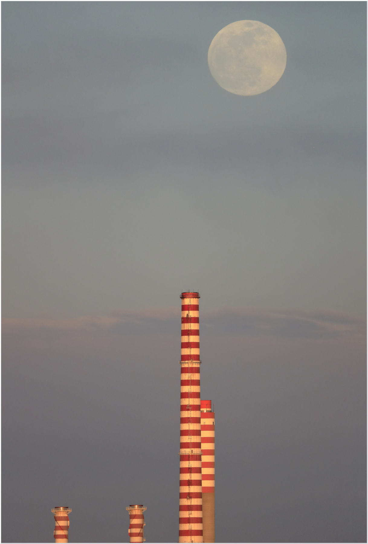 La luna appena sorta per qualche minuto e' rimasta nel campo del frame ma saliva velocemente, non ho avuto il tempo di spostarmi qualche centinaio di metri per centrare meglio la luna rispetto alle ciminiere. Ne è uscita questa foto