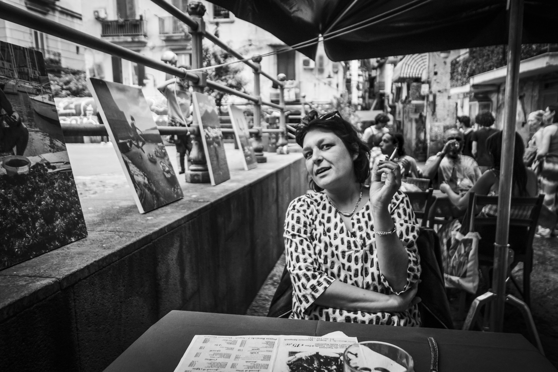 Nel caos estremo dal sapore meridionale la bella e spontanea espressione della donna unitamente alla sua posa naturale hanno la forza di richiamare e catturare chi osserva.