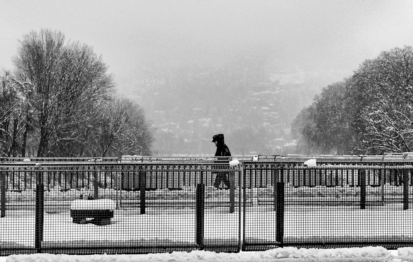 Bella questa inquadratura, il pattern del reticolato, il passante coperto, ma apparentemente non troppo freddoloso, il paesaggio offuscato dalla precipitazione...