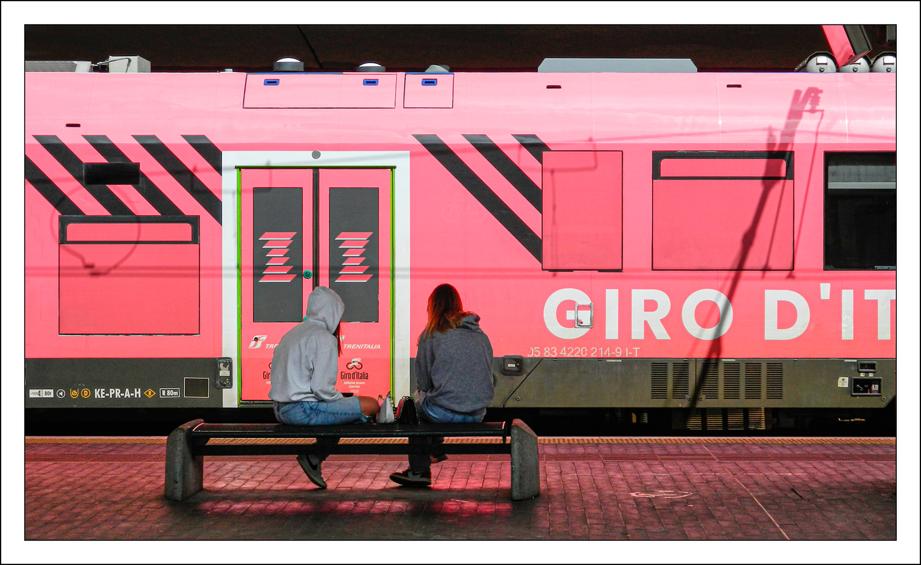 Tutto si tinge di rosa compresa la banchina ferroviaria e le quota rosa (le due donne). Quale migliore omaggio al giro d'Italia?