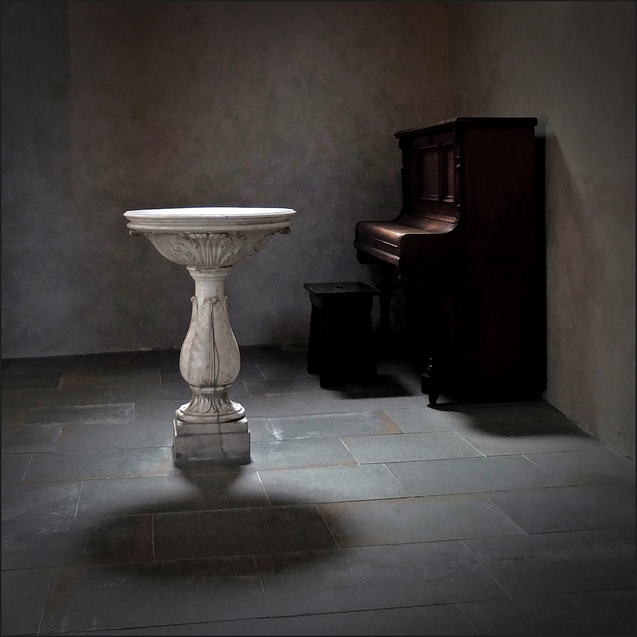 È un quadro che raffigura un interno essenziale e armonico. Il pianoforte con il suo sgabello e l'acquasantiera sono efficacemente disposti e ben illuminati in un generale tenuemente caldo e piacevole cromatismo. Ciao, Francesco