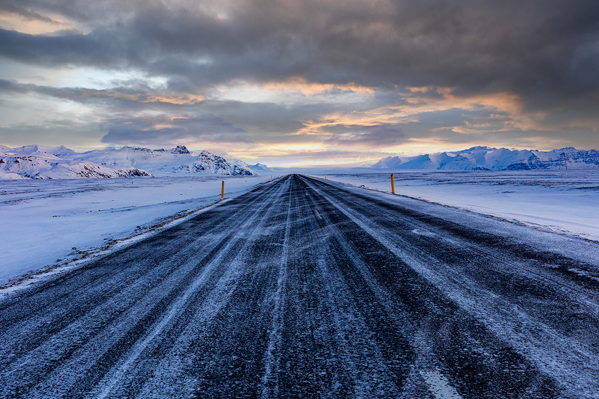 Bello il contrasto tra il freddo della strada e il cielo colorato.