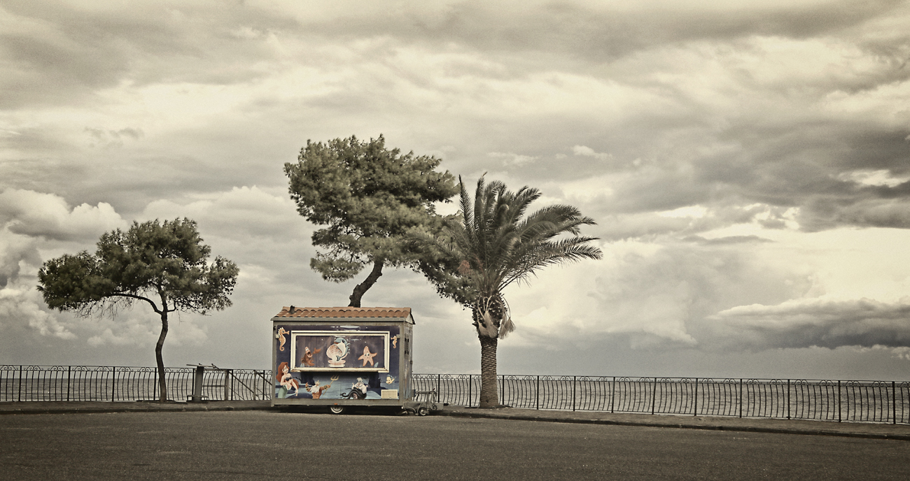 Un cielo carico di nubi che sembrano uscita dal pennello di un pittore, le chiome degli alberi esposte al vento, la struttura colorata al centro che sembra voler essere protetta dai tre alberi: un quadro molto bello anche se malinconico.