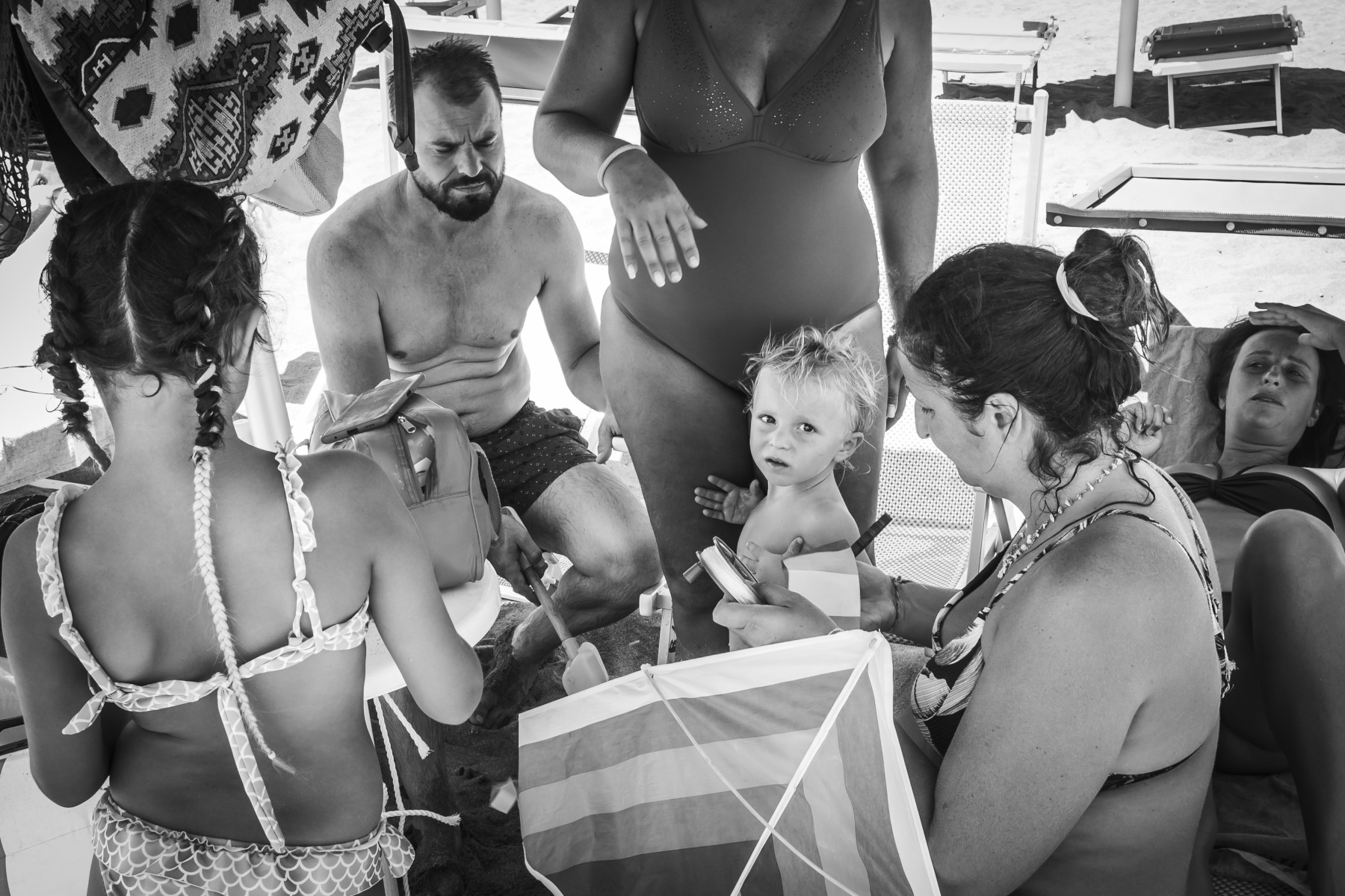 Questo gruppo compresso e ammassato sotto la striminzita ombra dell'ombrellone, mi conferma la strisciante antipatia che mi sta venendo per le spiagge.
