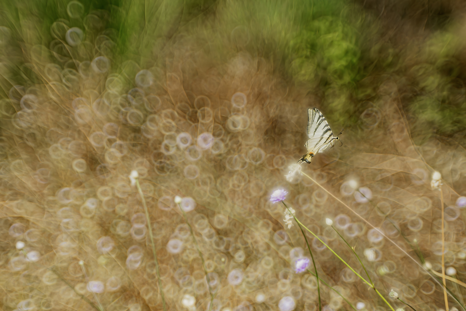 La trovo poetica e molto bella. Unico punto a fuoco la farfalla che si libra fra questi meravigliosi giochi di luce e colore.