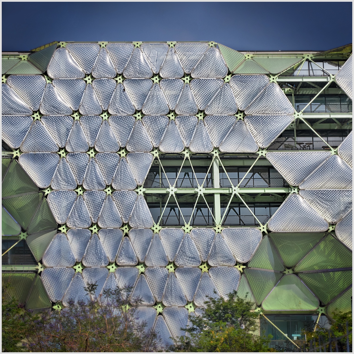 La struttura di acciaio, bioluminescente, è costituita da portali reticolari da cui si sospendono i solai interpiano. L’involucro è una combinazione molto personale dell’architetto Enric Ruiz-Geli con parti rivestite di cuscini pneumatici in ETFE, attraente e allo stesso tempo funzionale per l’autoregolazione della luce e della temperatura interne. "