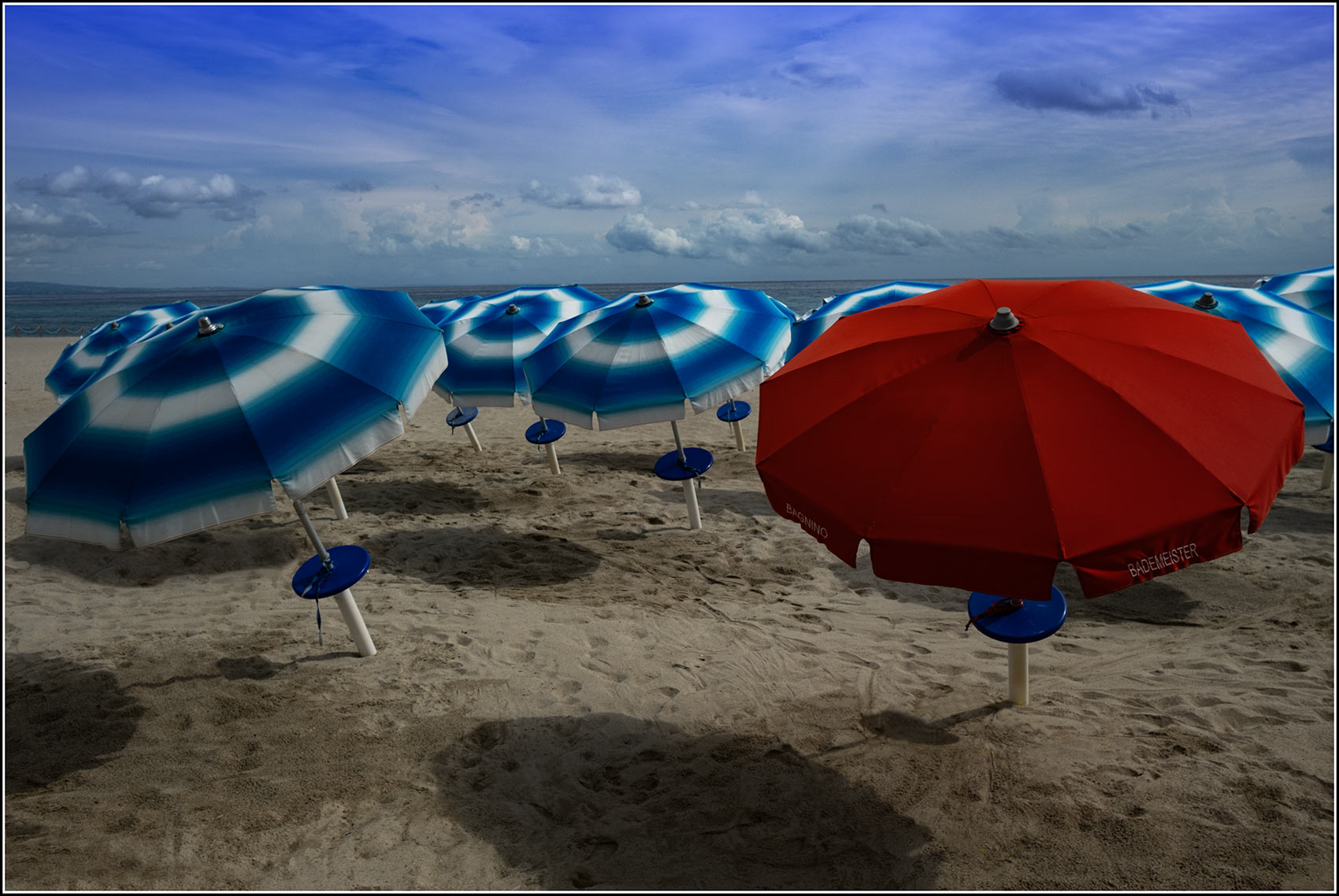 Ombrelloni che non si rassegnano alla fine della stagione, incoraggiati da quello rosso.