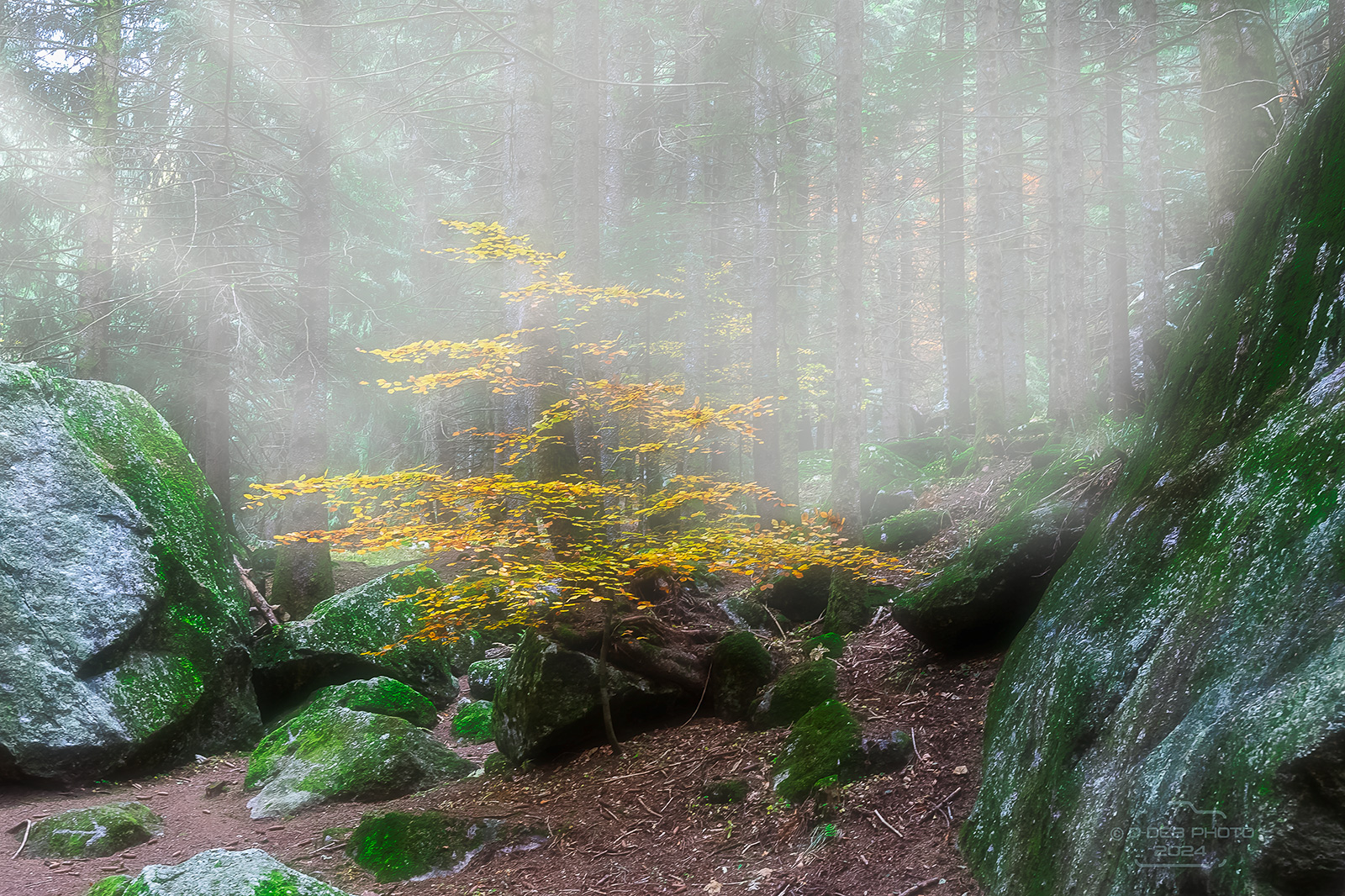 Delicatamente poetica. I colori autunnali emergono dalla leggera foschia che ammanta il sottobosco.