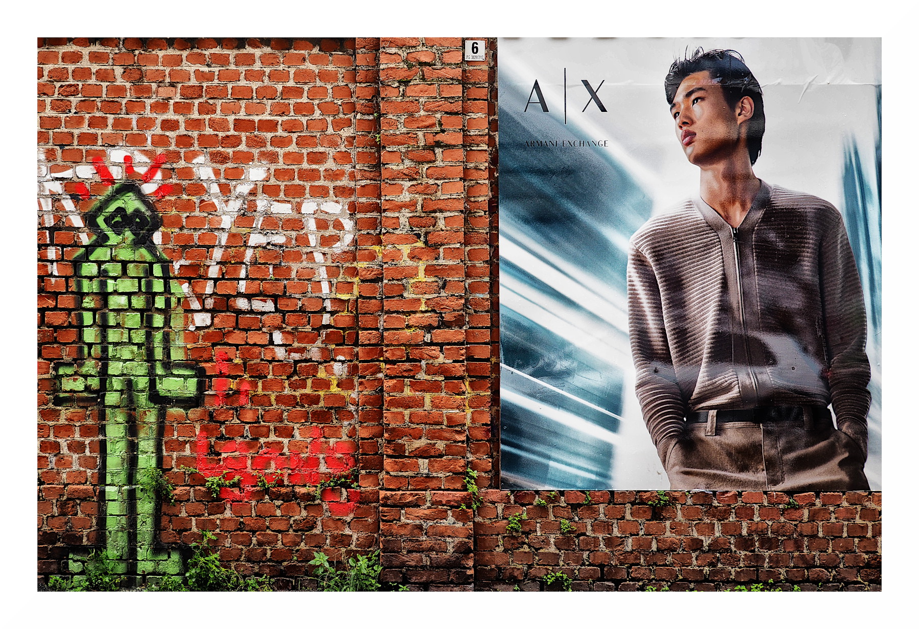 Con questo scatto cogli l'intreccio tra graffiti e pubblicità, le due figure hanno gli sguardi rivolti quello di sx verso il manifesto pubblicitario, quello di dx verso un punto imprecisato con il muro che li separa ma anche che li accomuna.