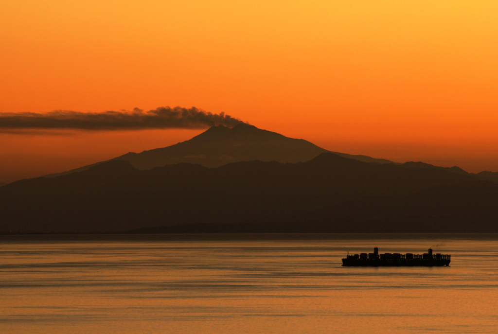 C'è un dialogo tra il profilo del monte che fuma e quello della nave che va.
