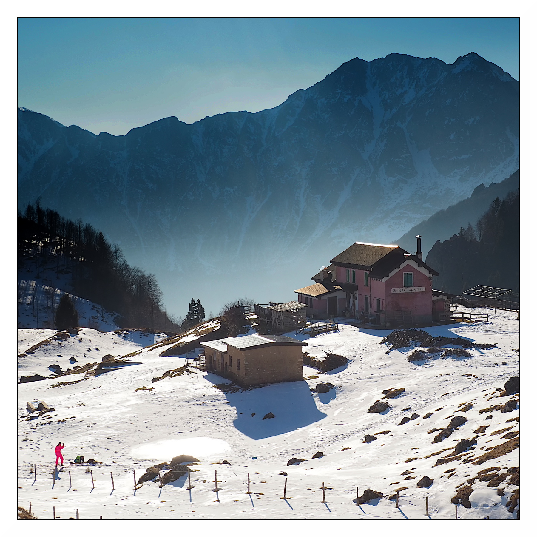 La prima cosa che salta all'occhio è l'imponenza della montagna sullo sfondo che sovrasta la malga e poi il suo colore rosa tra il bianco della neve e l'atmosfera bluastra della montagna.