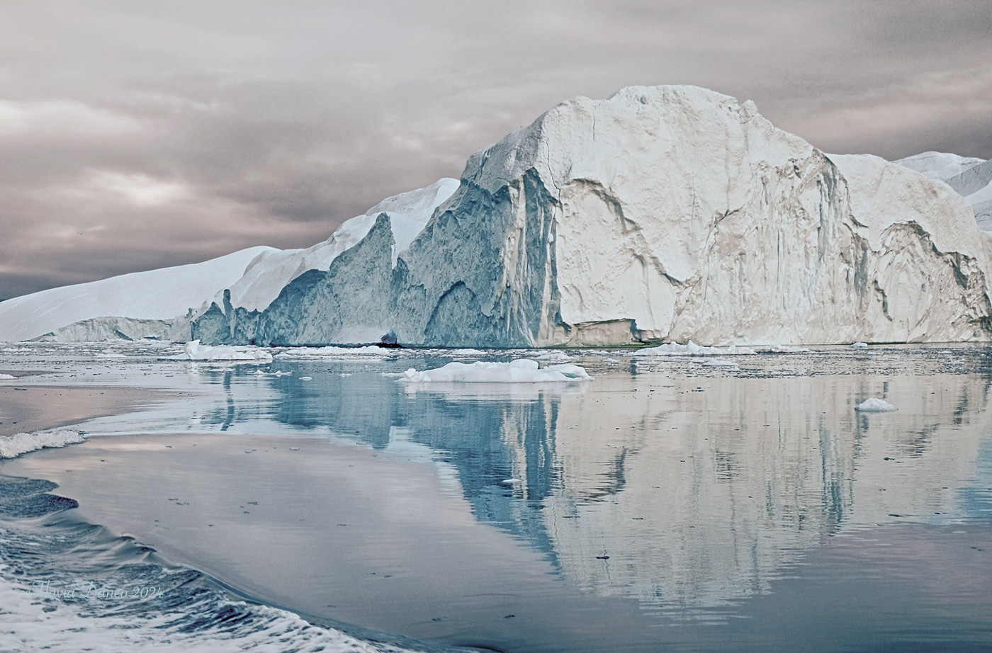 L'iceberg con la sua mole domina la scena e crea una simmetria con il suo riflesso nell'acqua.